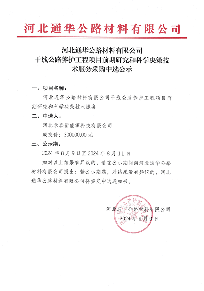 河北通华公路材料有限公司出让廊坊通泰公路材料有限公司股权项目前期咨询服务采购中选公示