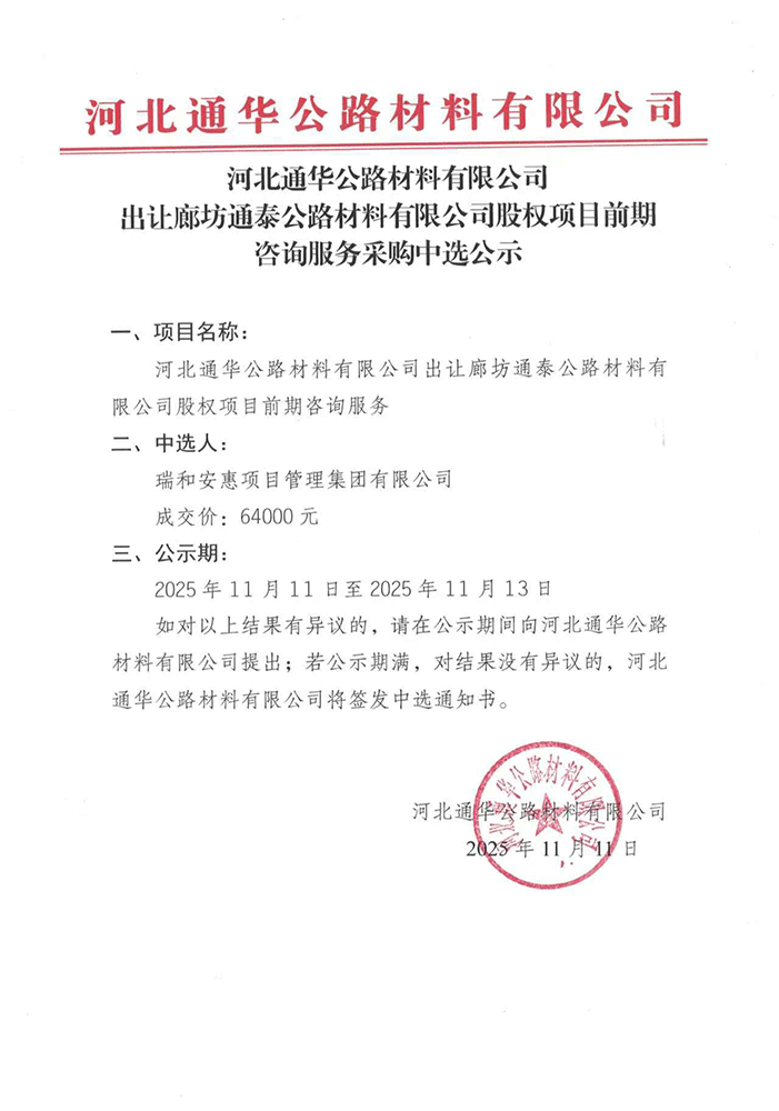 河北通华公路材料有限公司干线公路养护工程项目前期研究和科学决策技术服务采购中选公示