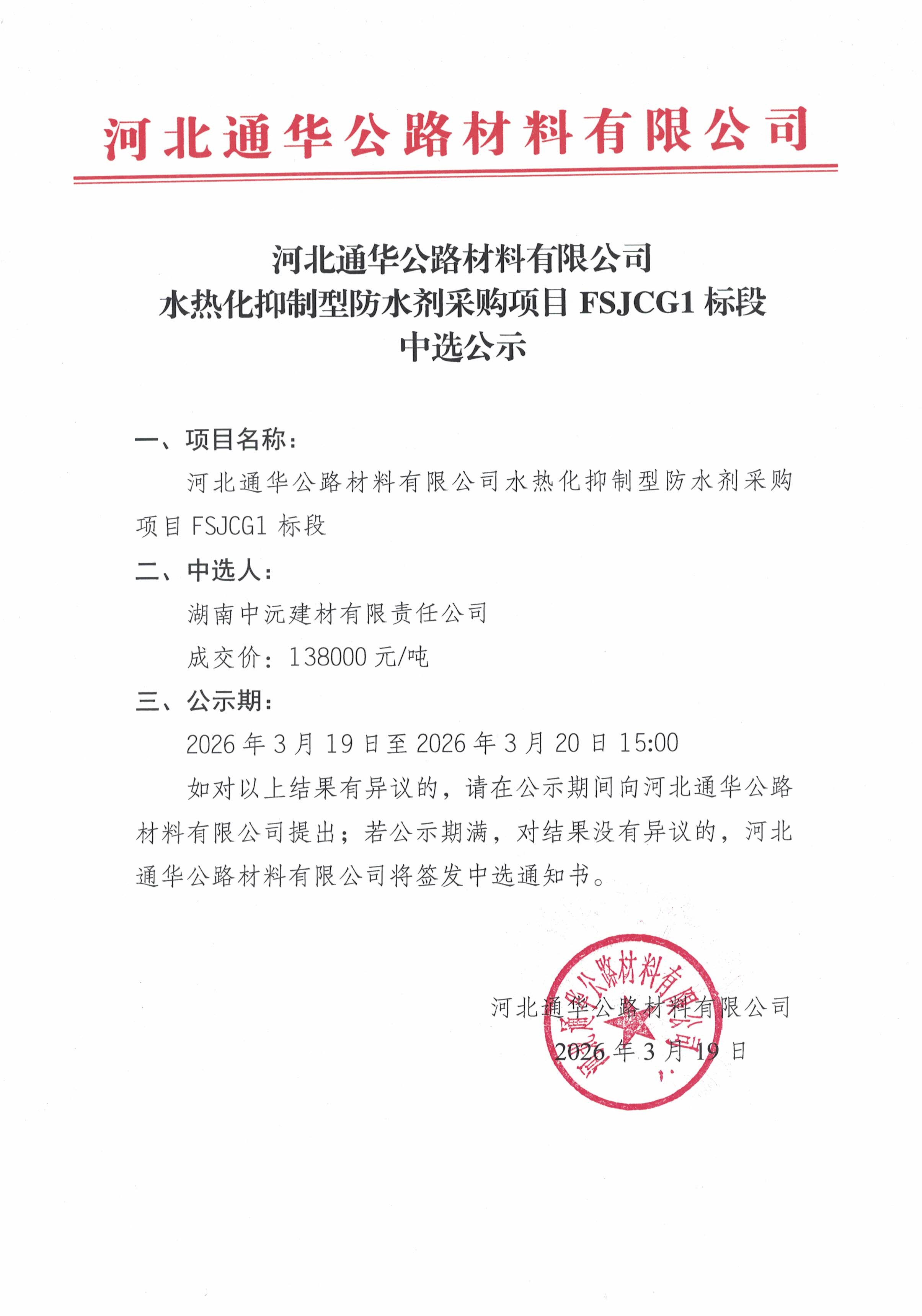 首页 » 招标信息 » 中标公示 » 河北通华公路材料有限公司水热化抑制型防水剂采购项目FSJCG1标段中选公示